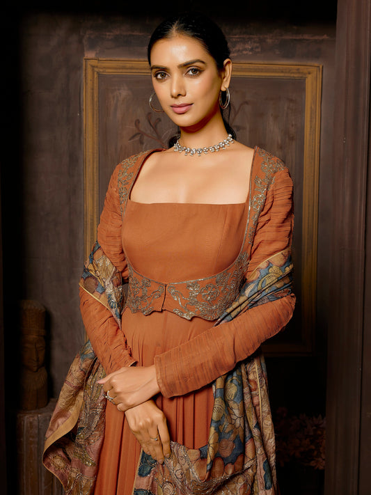 Rustic Orange Pure Georgette Gown with Flairy Palazzo and Klamkari Handwork Dupatta