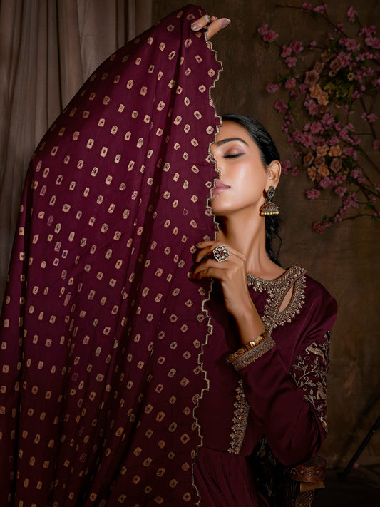 Handcrafted Maroon Anarkali Set with Cutwork Bandni Dupatta