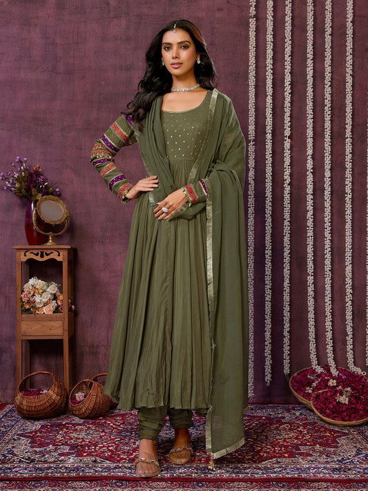 Olive Green Muslin Silk Flowy Dress with Trouser & Dupatta