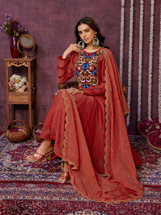 Rust Chanderi Silk Kurta Set with Organza Dupatta