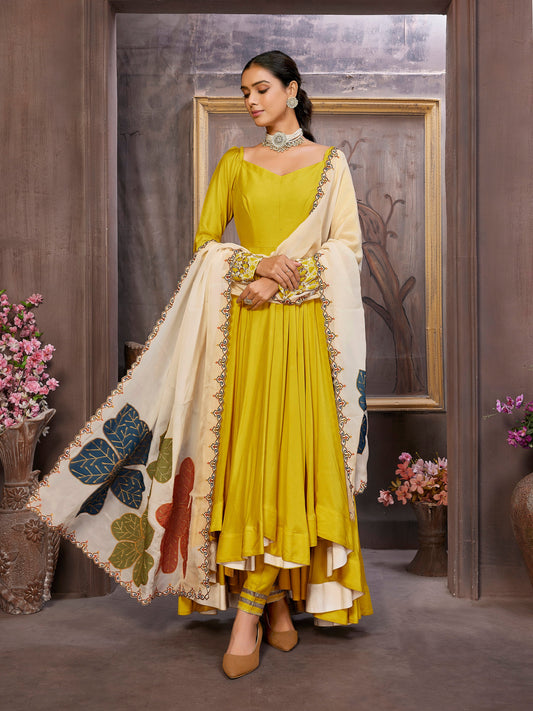 Yellow Anarkali Dress with Phool Ghera Organza Dupatta
