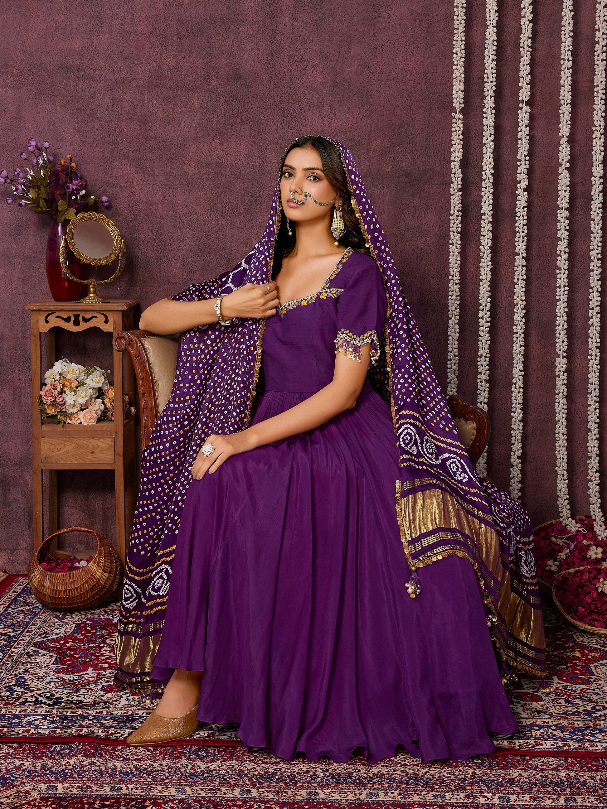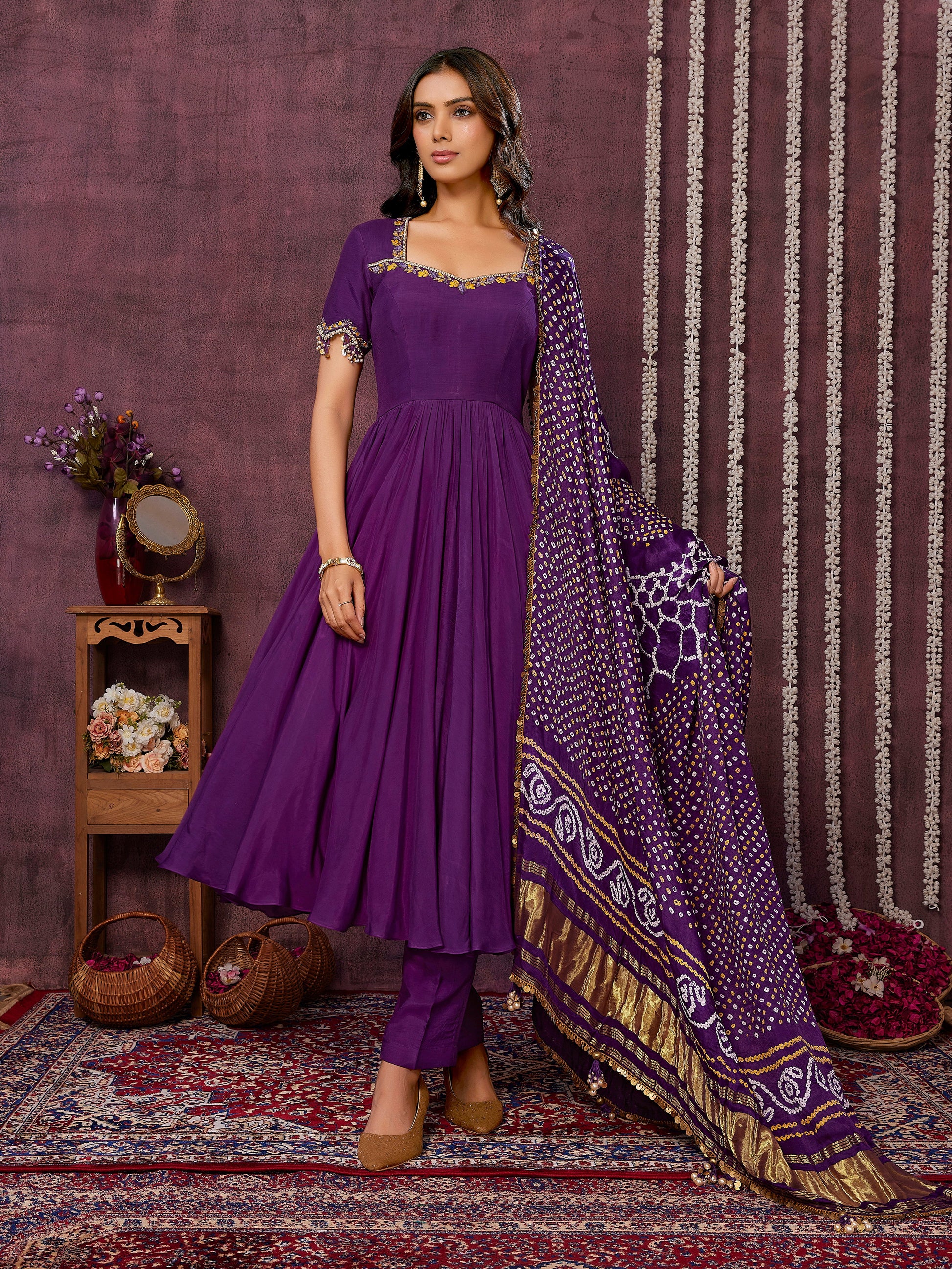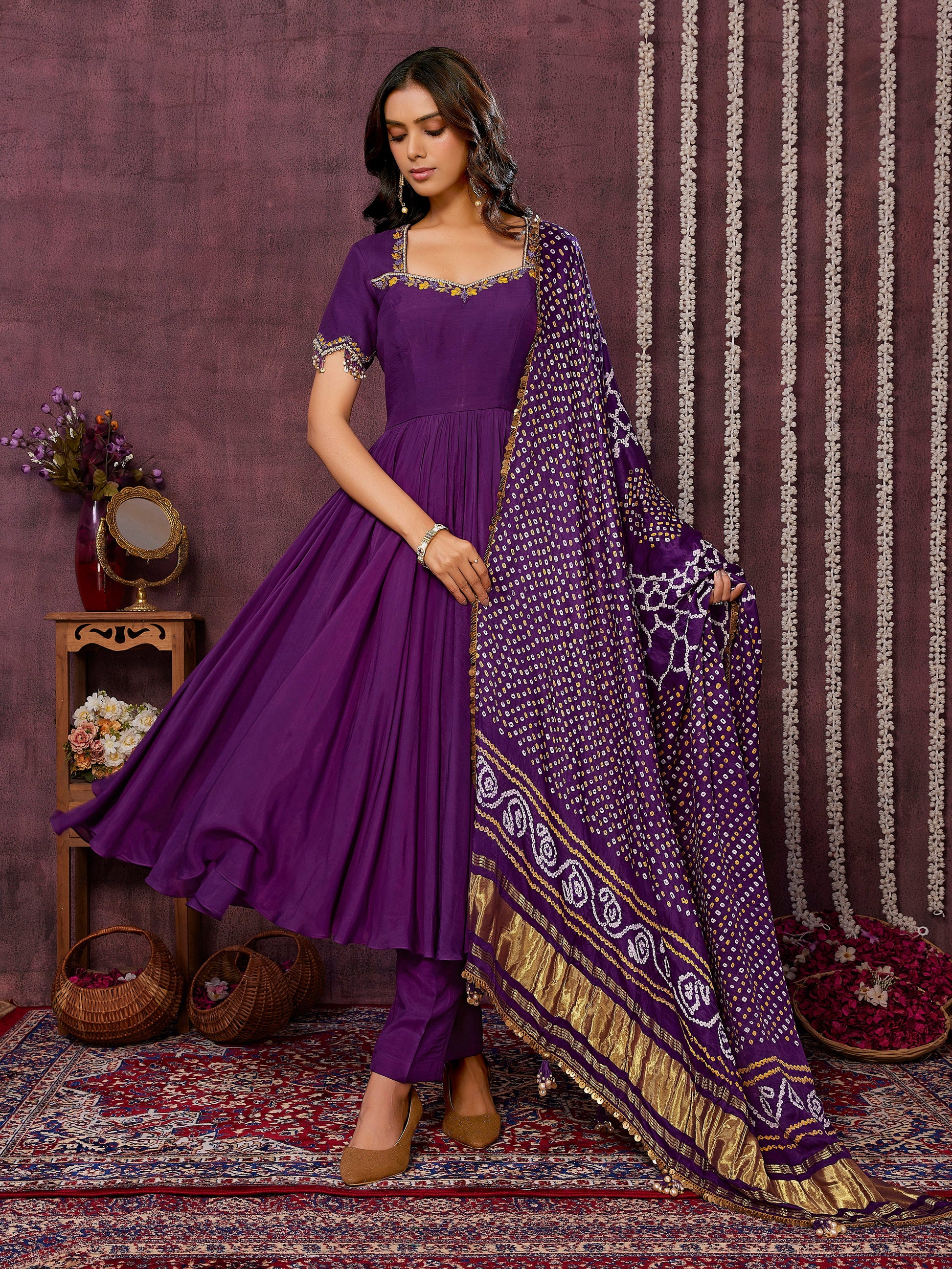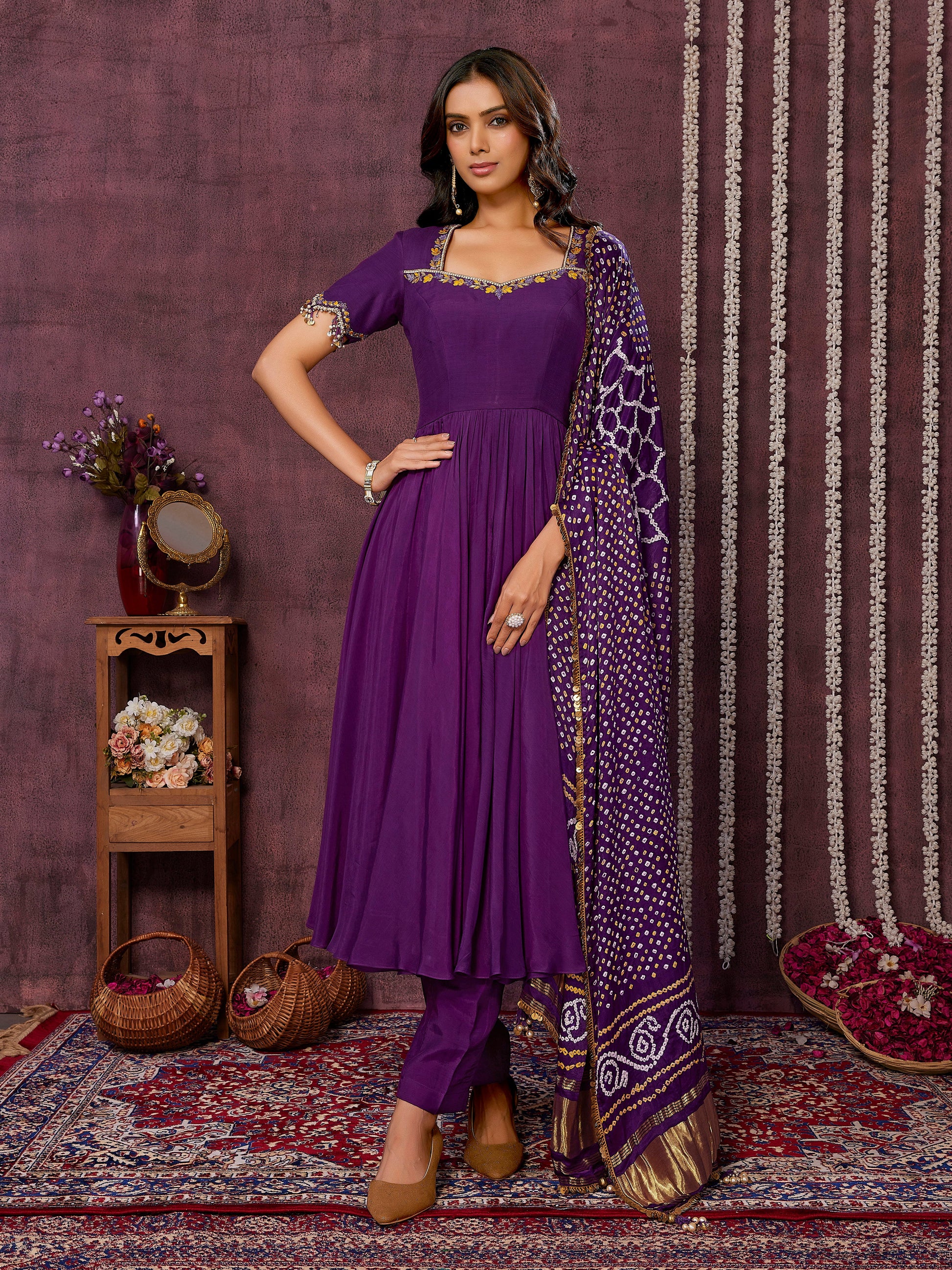 Crafted from rich muslin silk, this Anarkali kurta offers a beautiful drape and a soft, luxurious feel. The kurta showcases delicate hand embroidery using beads, sequins, and intricate thread work along the neckline and sleeves, adding a touch of glamour and artistry. The deep, regal shade of purple is designed to flatter all skin tones and make a statement, whether at weddings, festivals, or celebrations. -