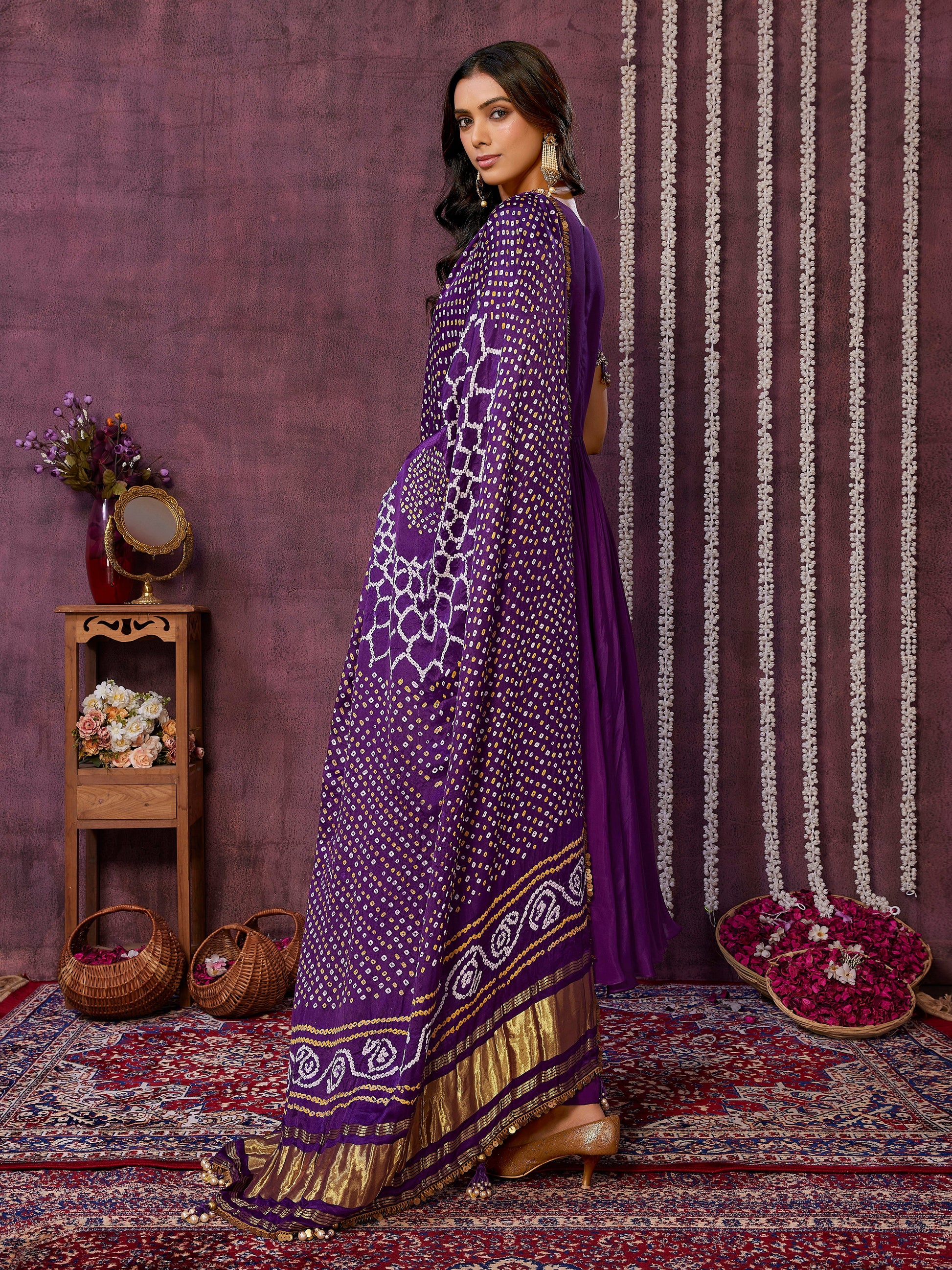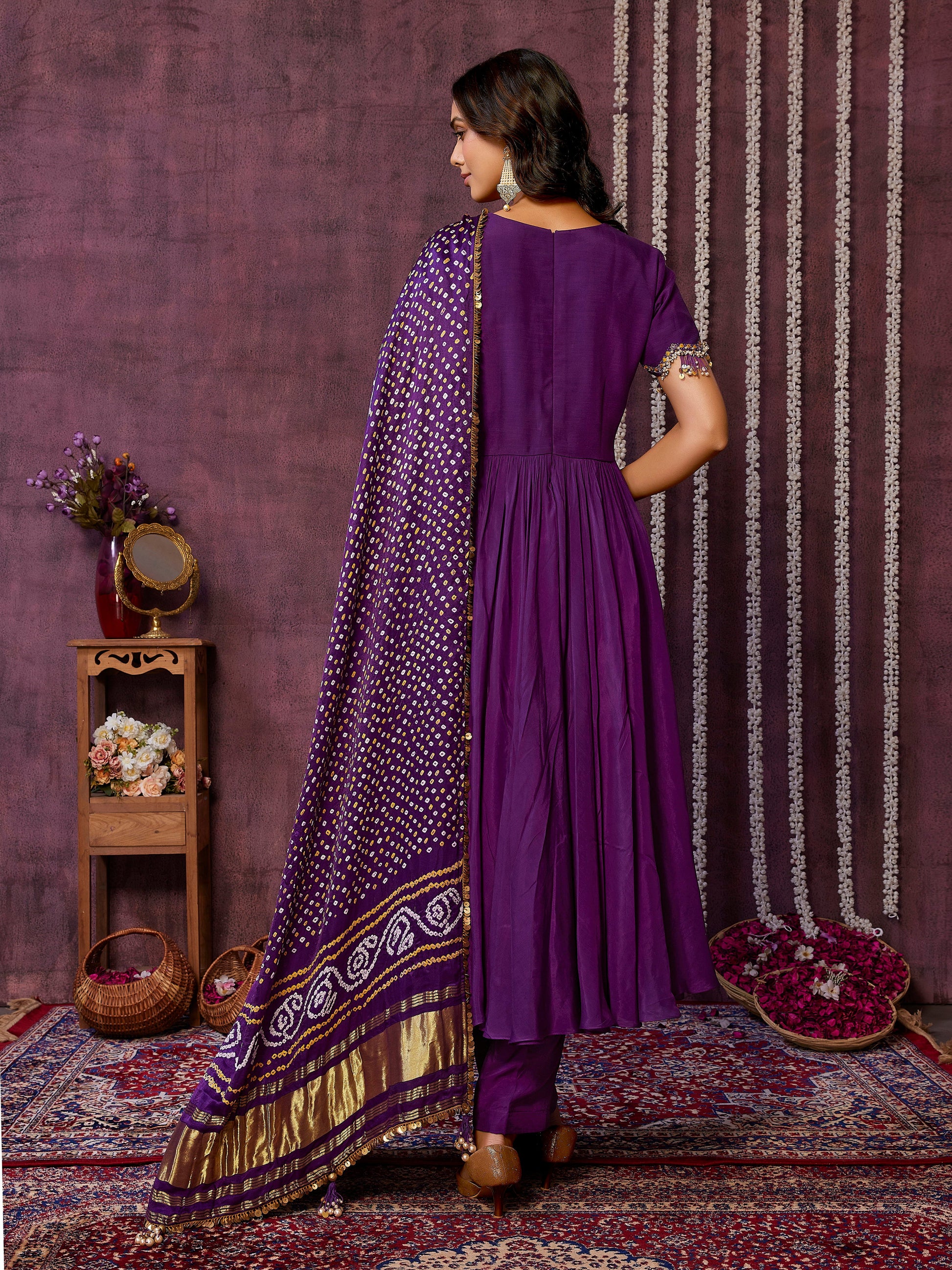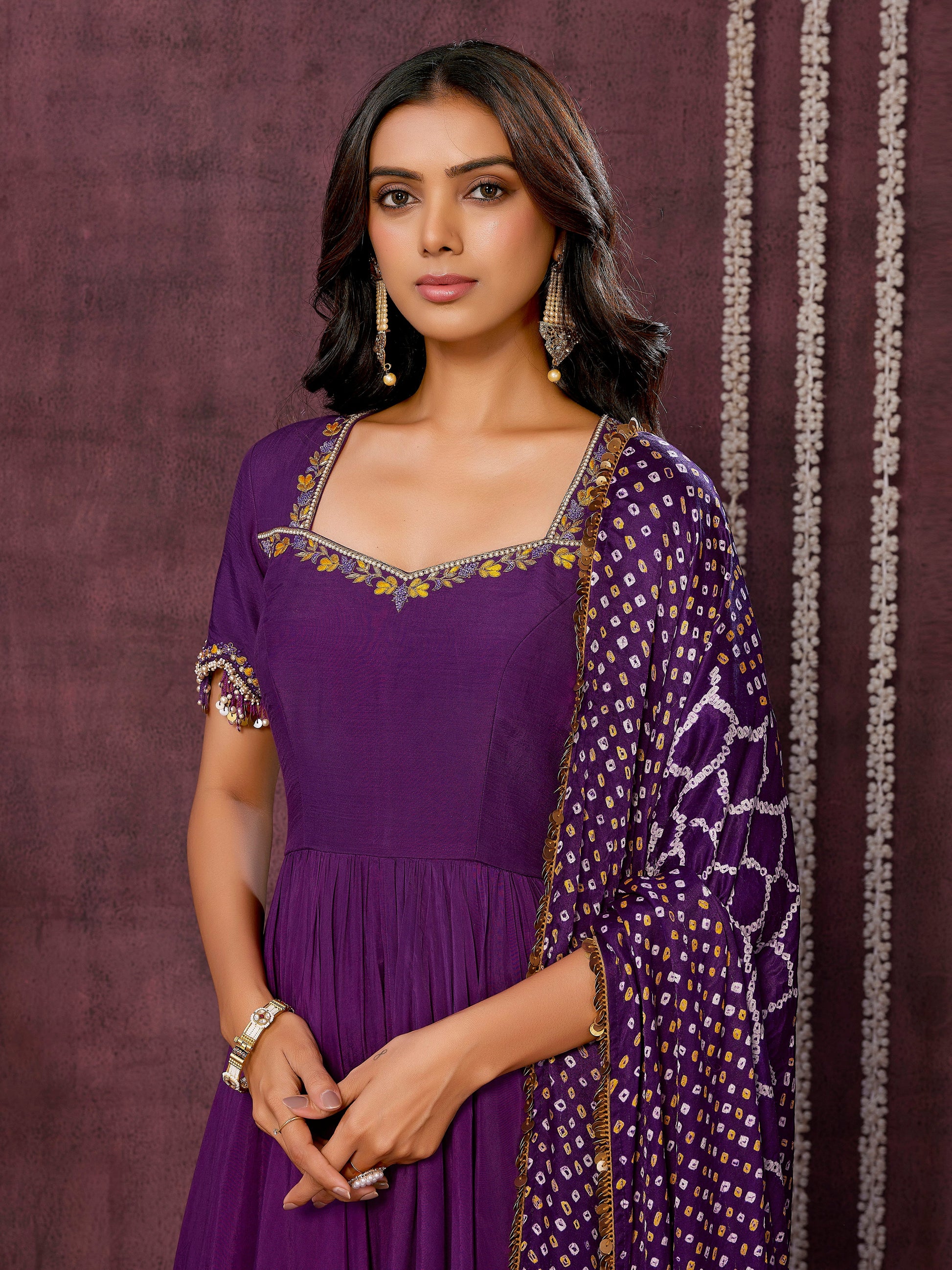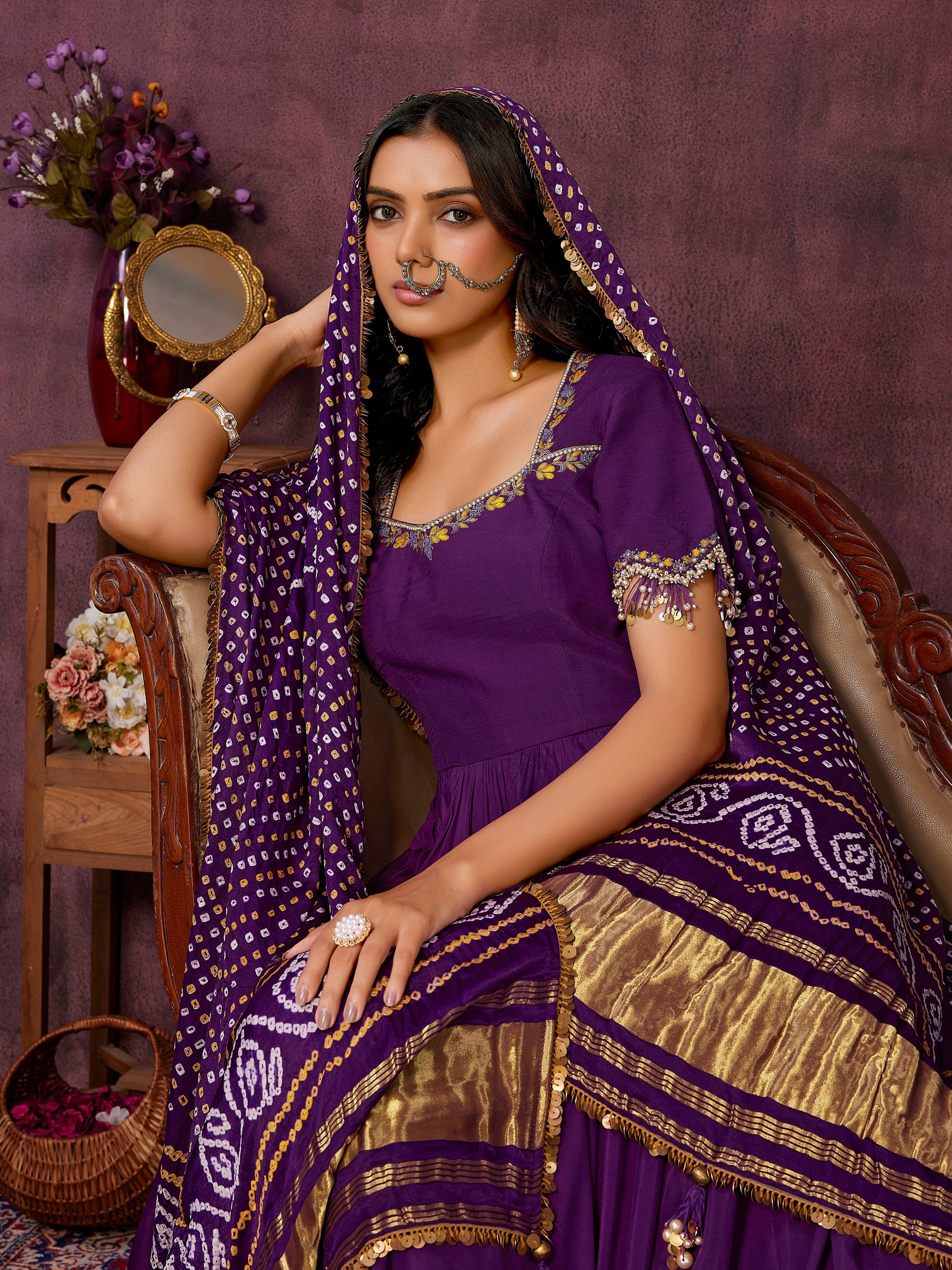 Crafted from rich muslin silk, this Anarkali kurta offers a beautiful drape and a soft, luxurious feel. The kurta showcases delicate hand embroidery using beads, sequins, and intricate thread work along the neckline and sleeves, adding a touch of glamour and artistry. The deep, regal shade of purple is designed to flatter all skin tones and make a statement, whether at weddings, festivals, or celebrations. -