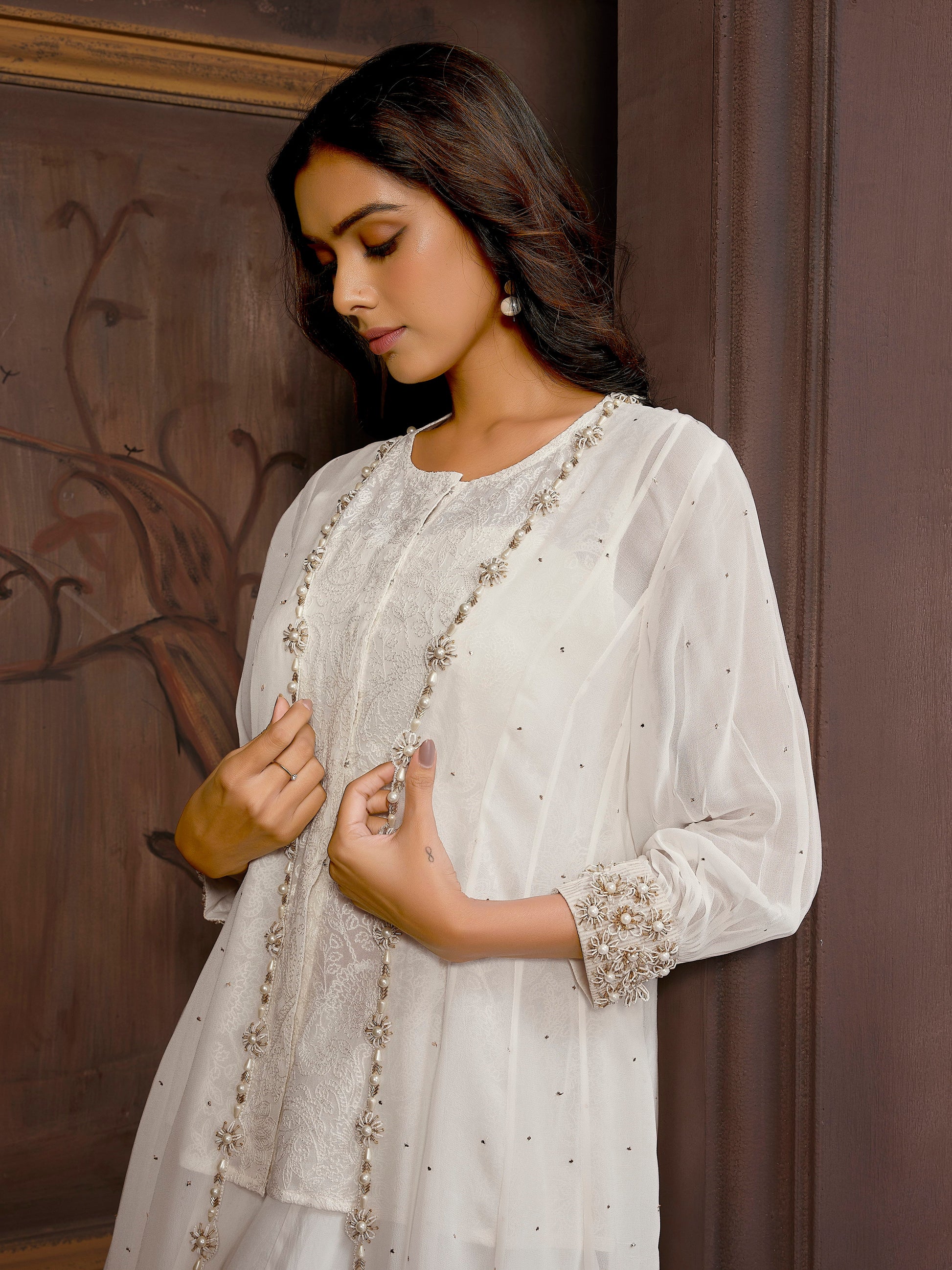Exude sophistication and grace with this 4-piece pure georgette white Indo-Western ensemble, a modern take on timeless elegance. With intricate Badla (Mukesh) work and self-thread embroidery, this versatile outfit seamlessly blends tradition with contemporary design, making it a perfect choice for festive events, evening gatherings, or even wedding ceremonies.