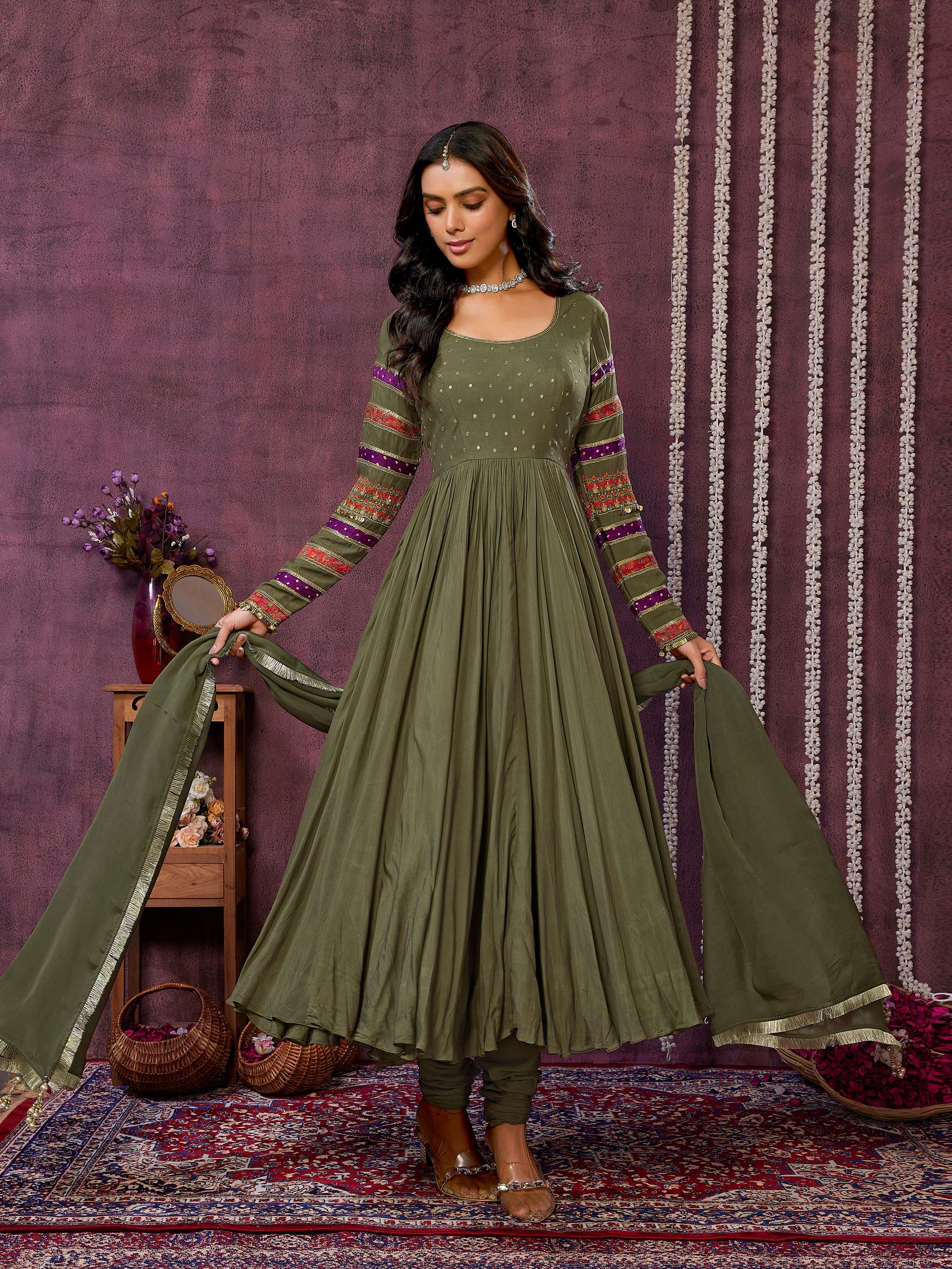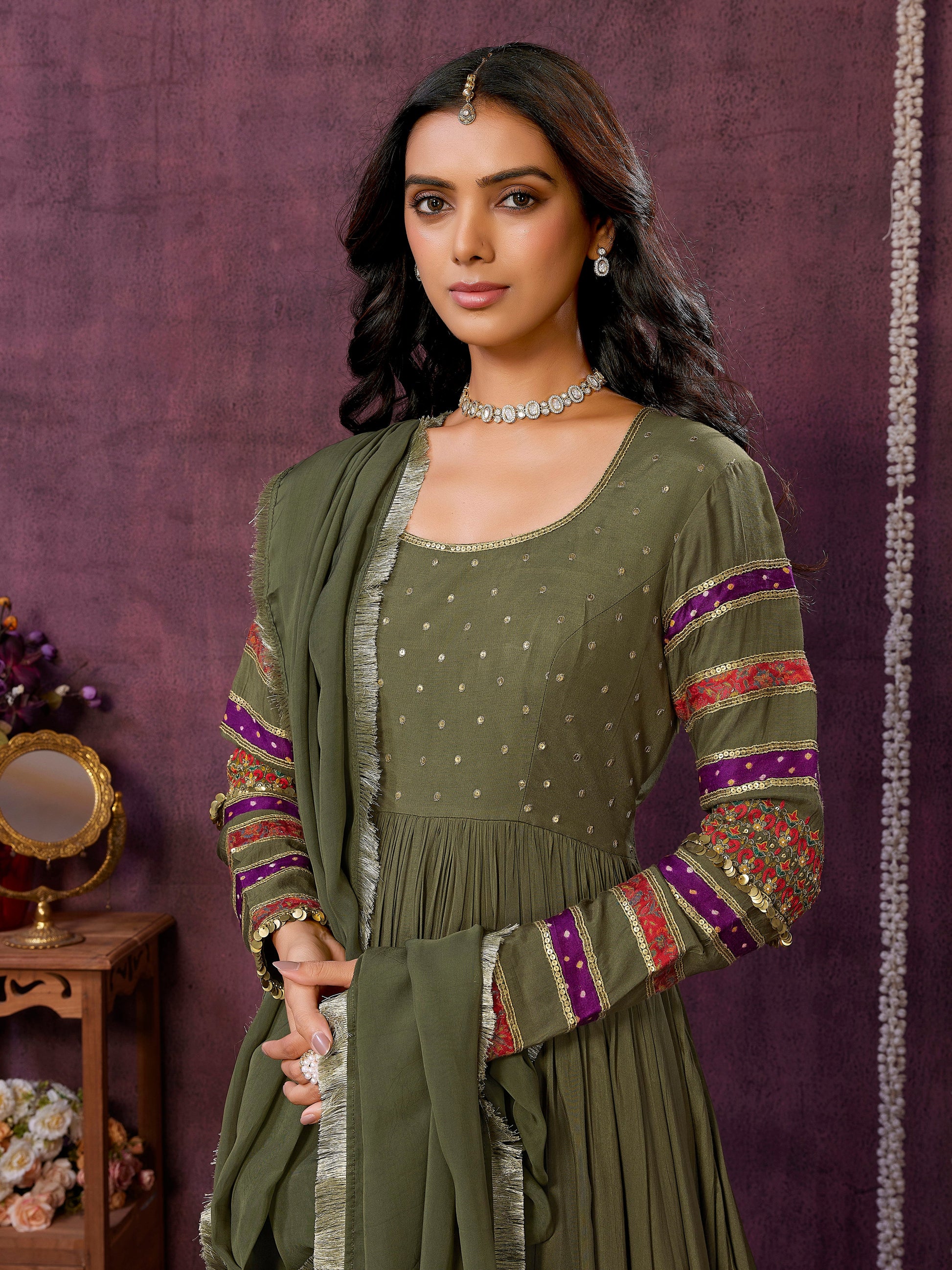 Olive Green Muslin Silk Flowy Dress with Trouser & Dupatta