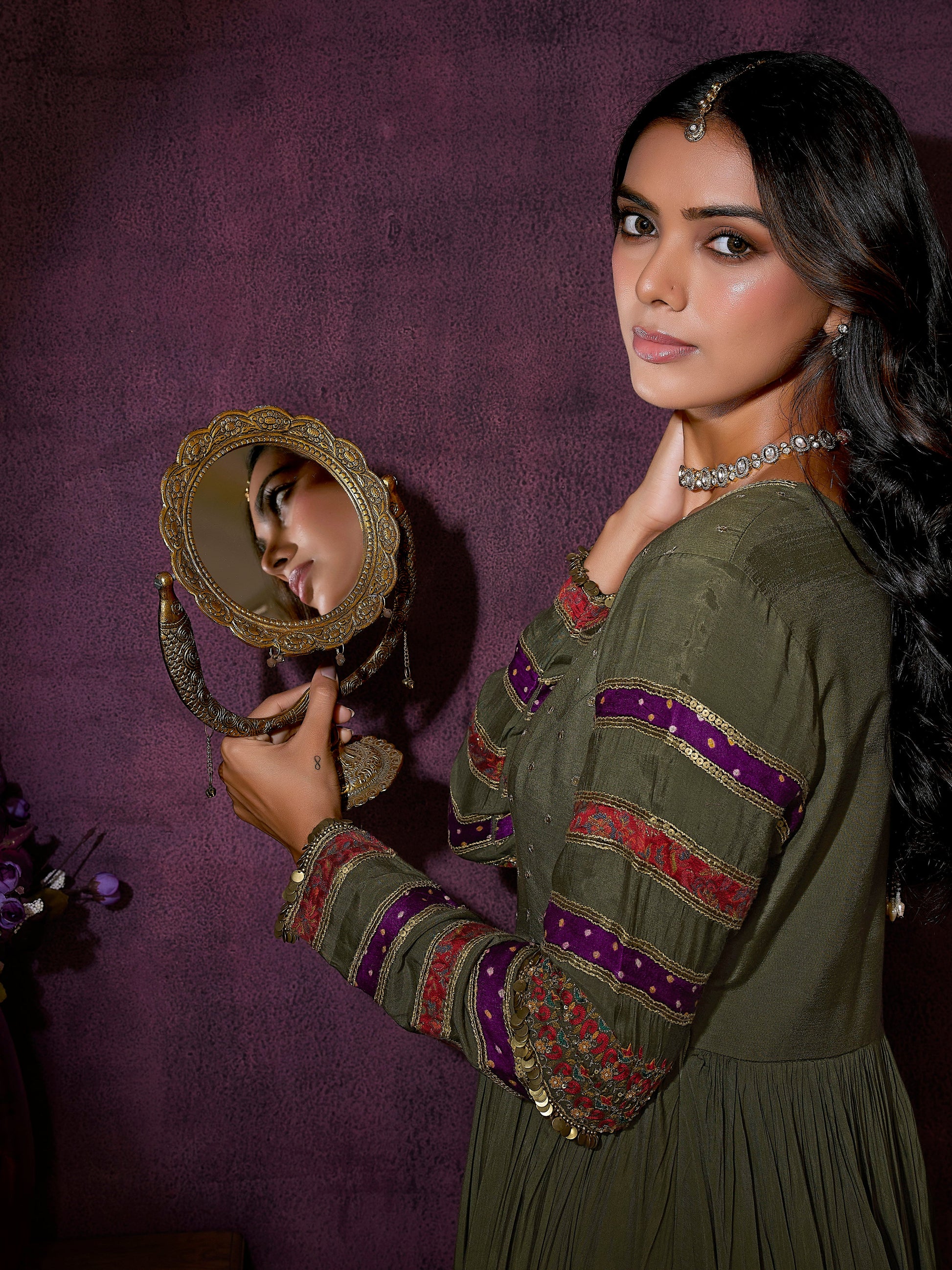 Step into elegance with this olive green muslin silk flared dress, a perfect blend of traditional craftsmanship and contemporary design. With intricate Pashmina hand embroidery, delicate Ginni sequence detailing, and patchwork accents, this outfit is ideal for weddings, festive celebrations, or any special occasion where you want to make a statement.