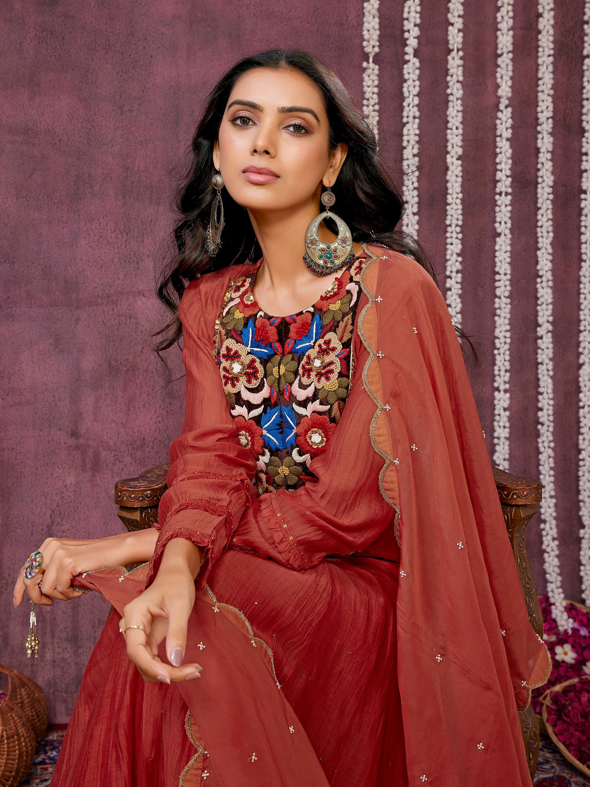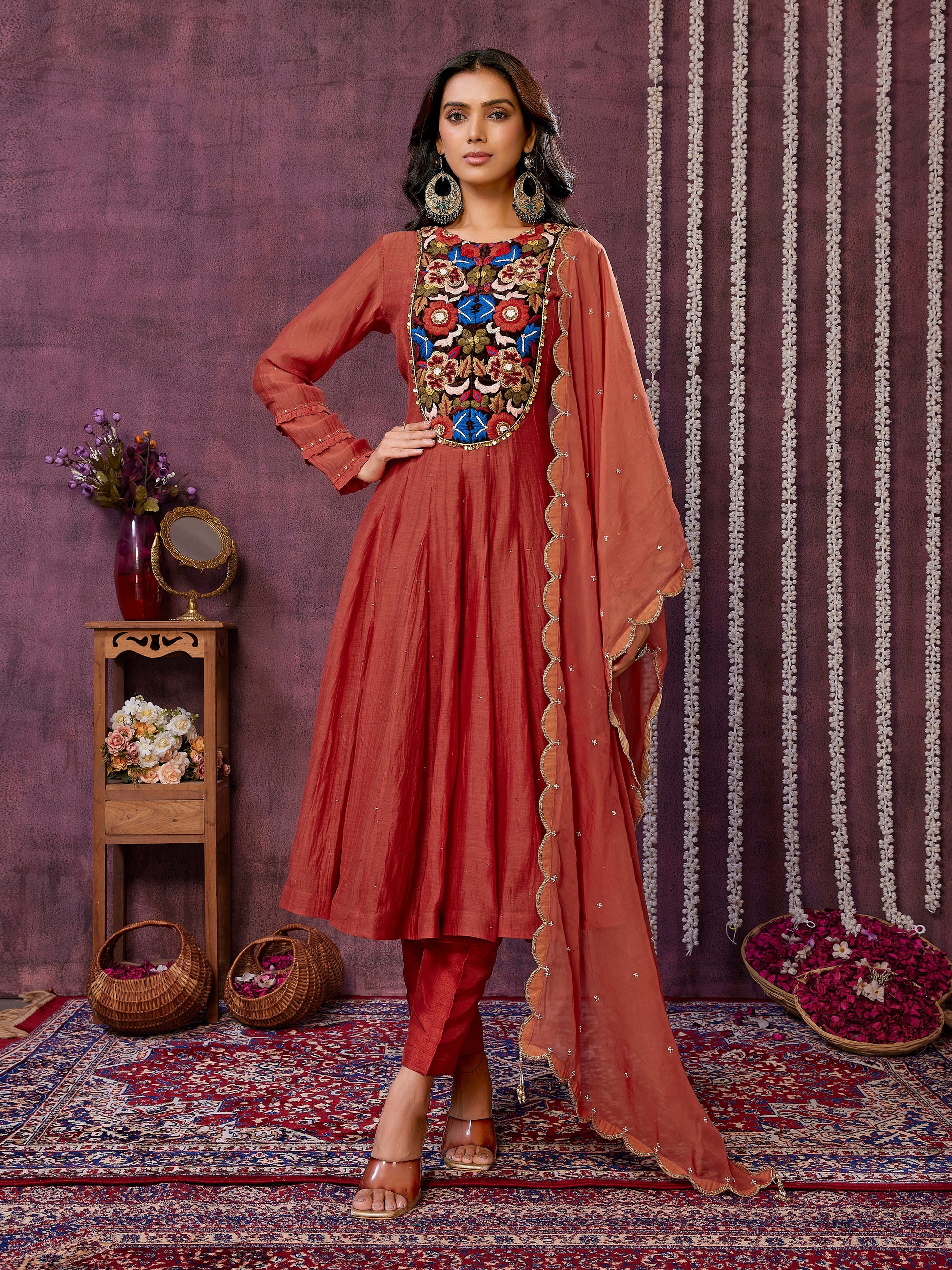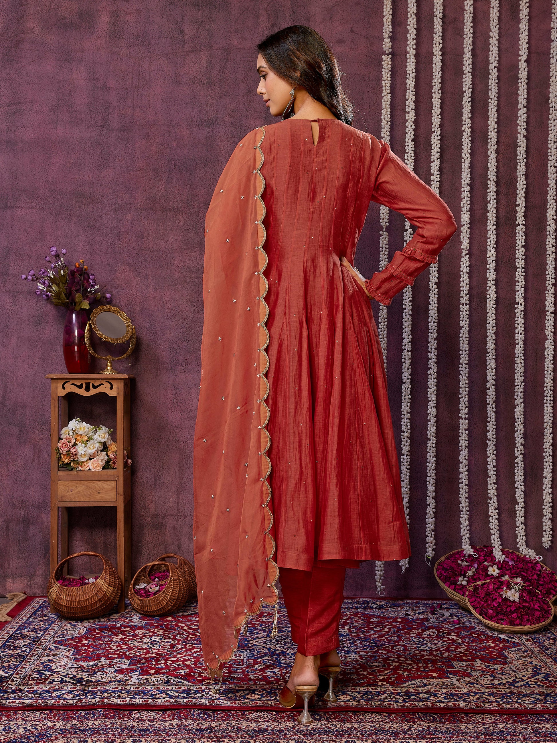Rust Chanderi Silk Kurta Set with Organza Dupatta