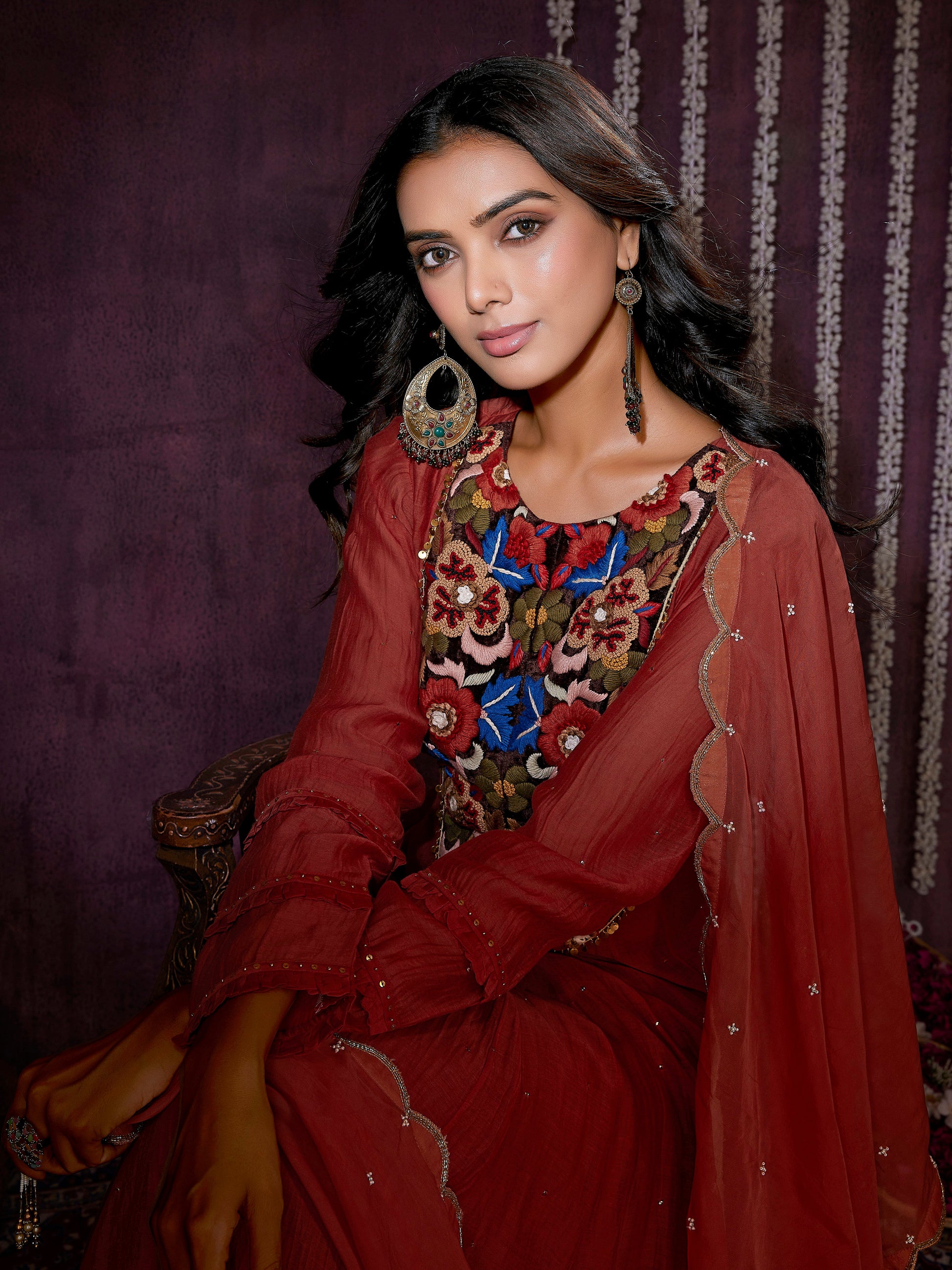 Radiate elegance in this rust-colored Chanderi silk kurta set, a harmonious blend of traditional artistry and modern sophistication. Perfect for festive occasions, family gatherings, or intimate celebrations, this ensemble is thoughtfully designed to enhance your style quotient.