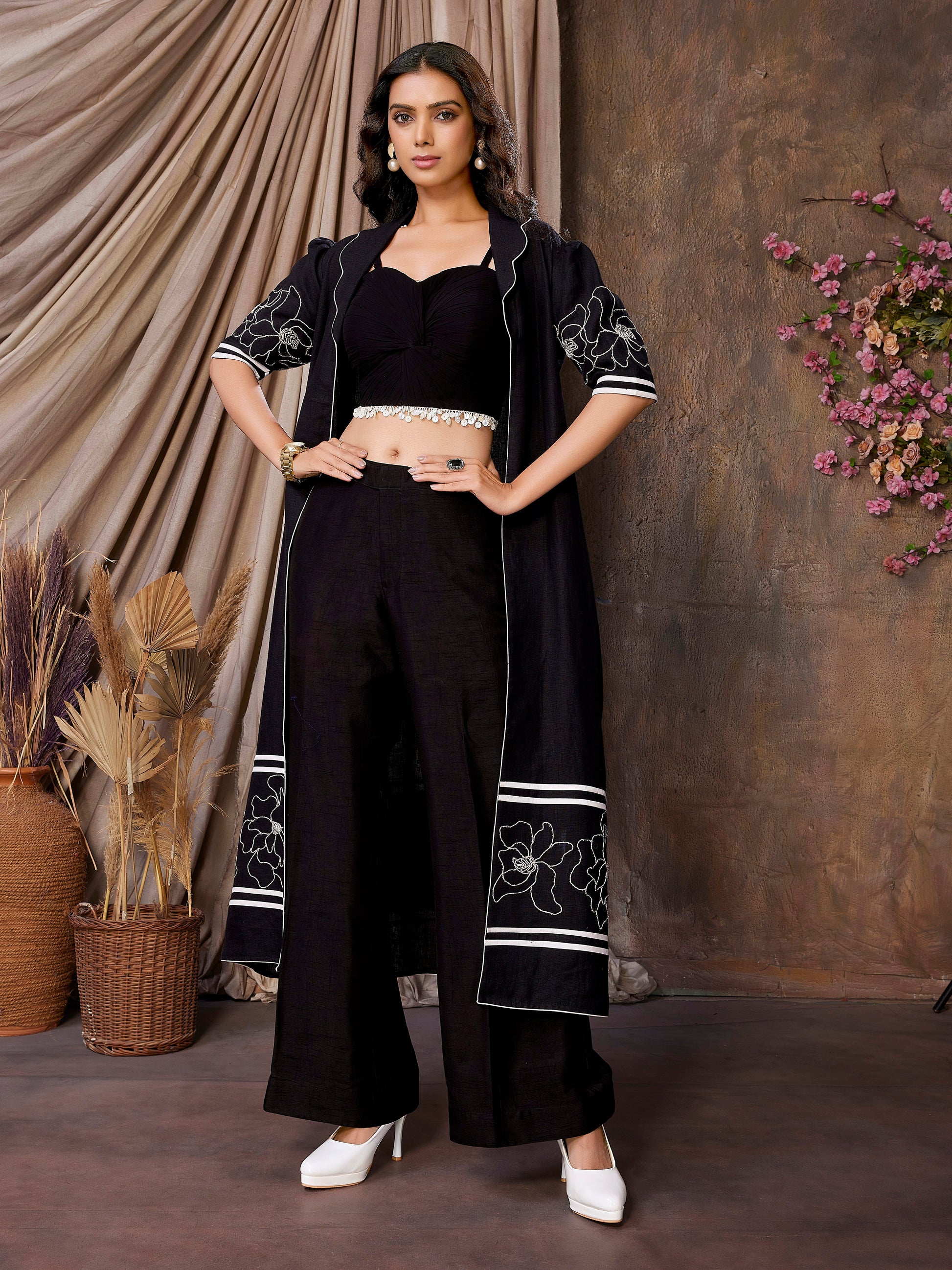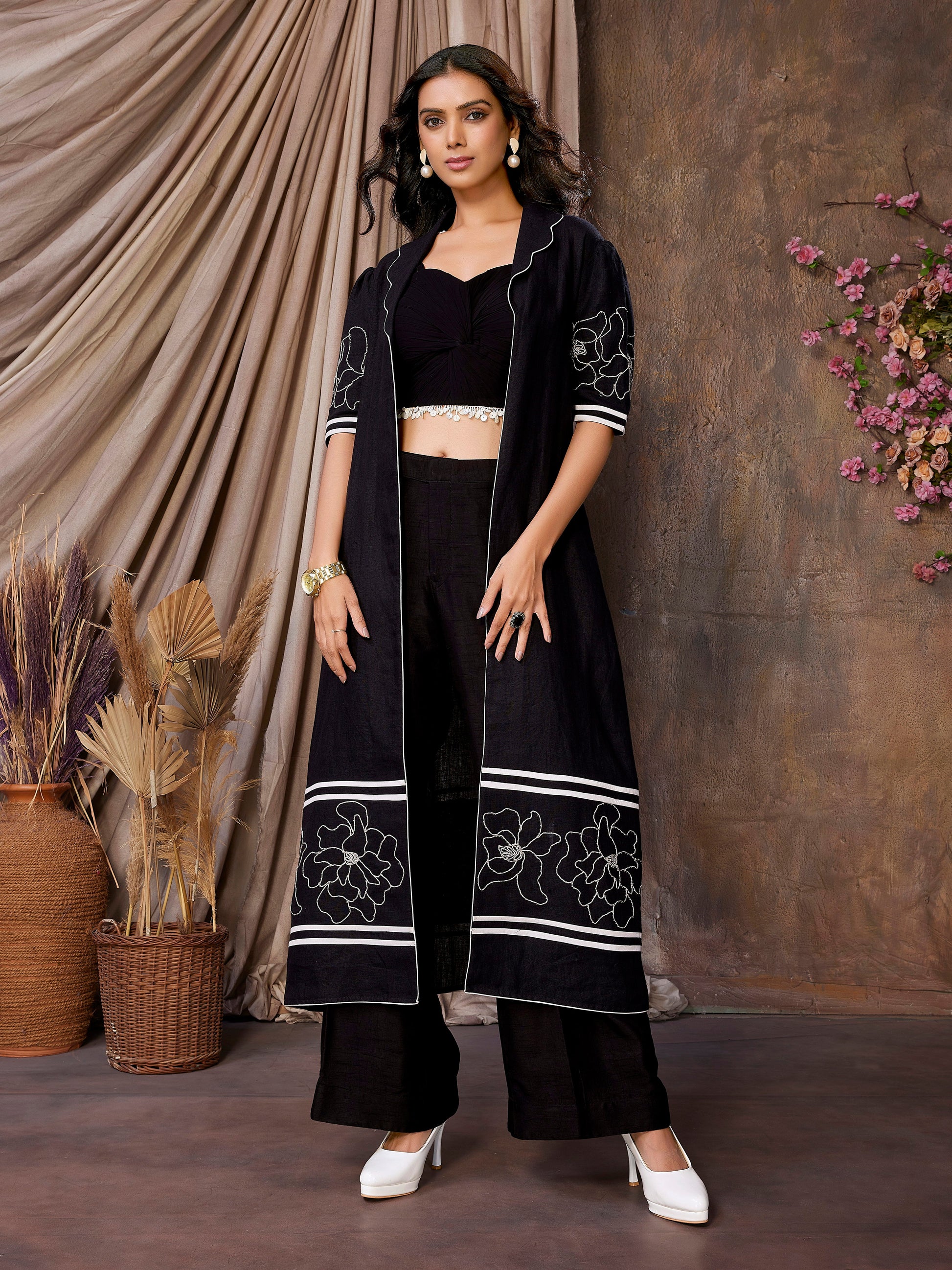 Black Pure Linen 3-Piece Set with Shrug, Pleated Tube, and Trouser