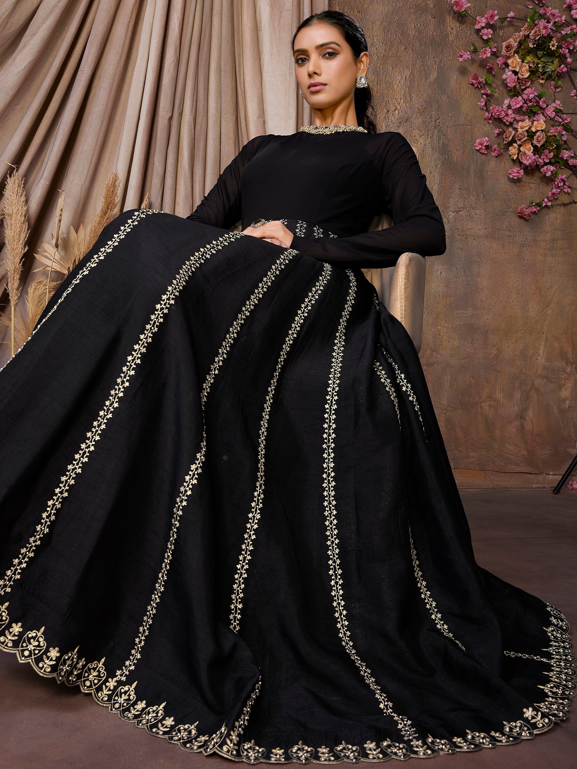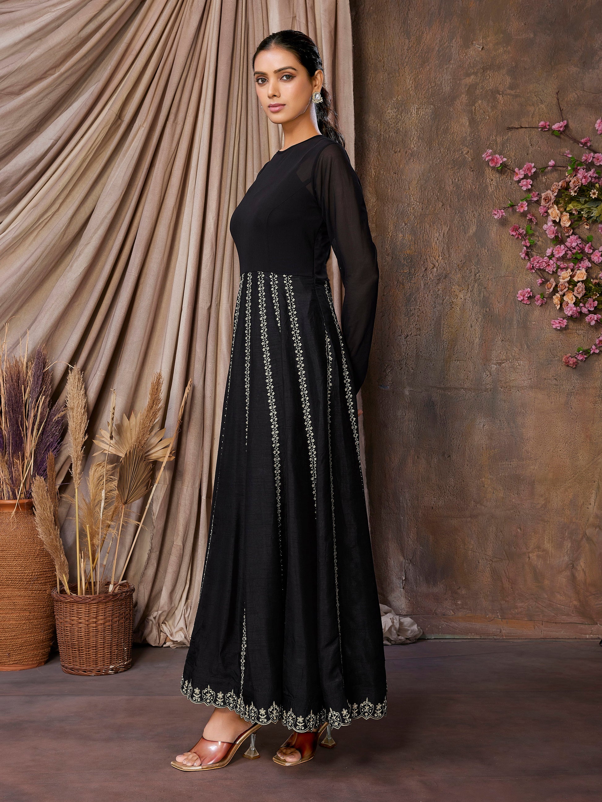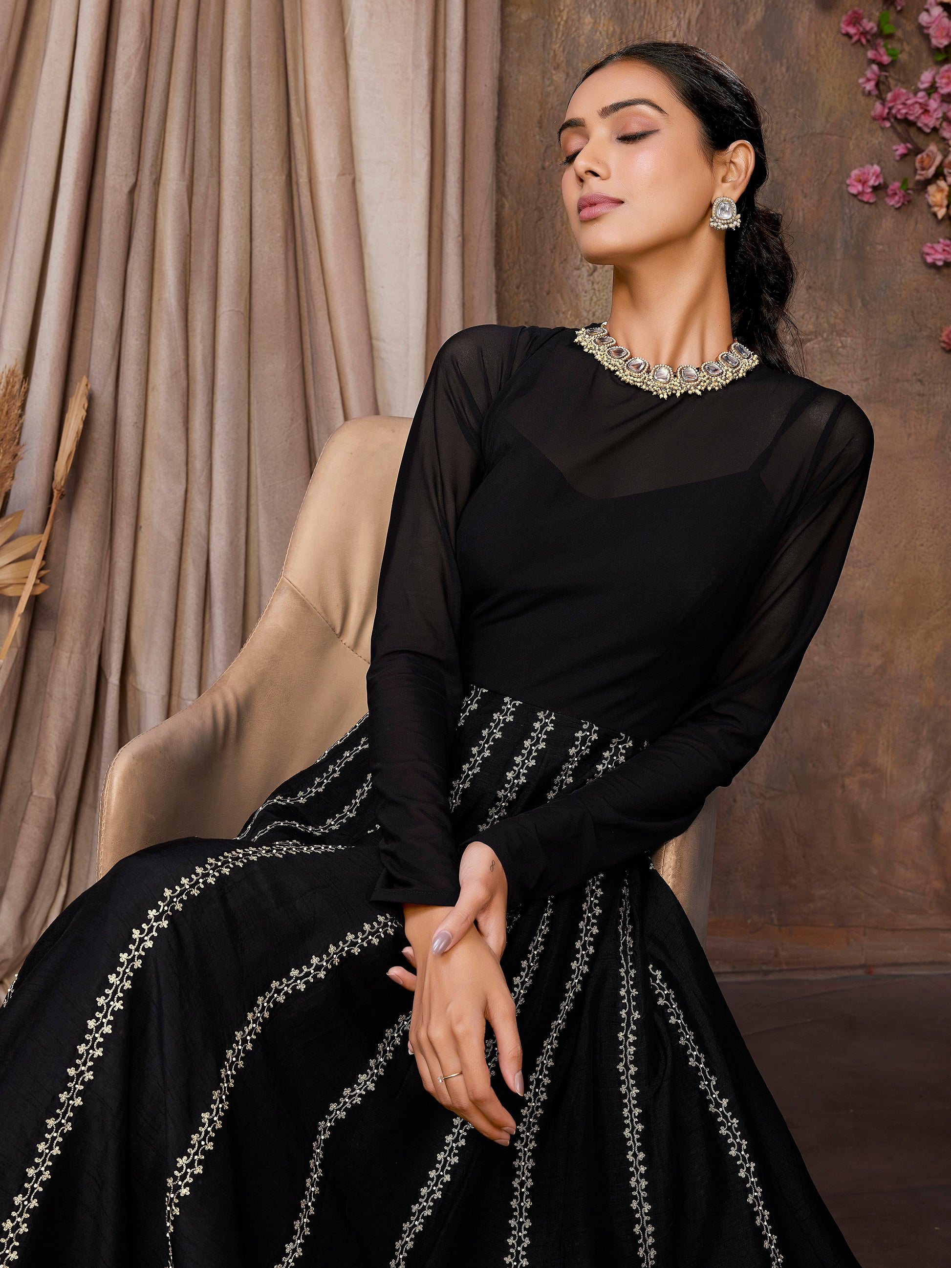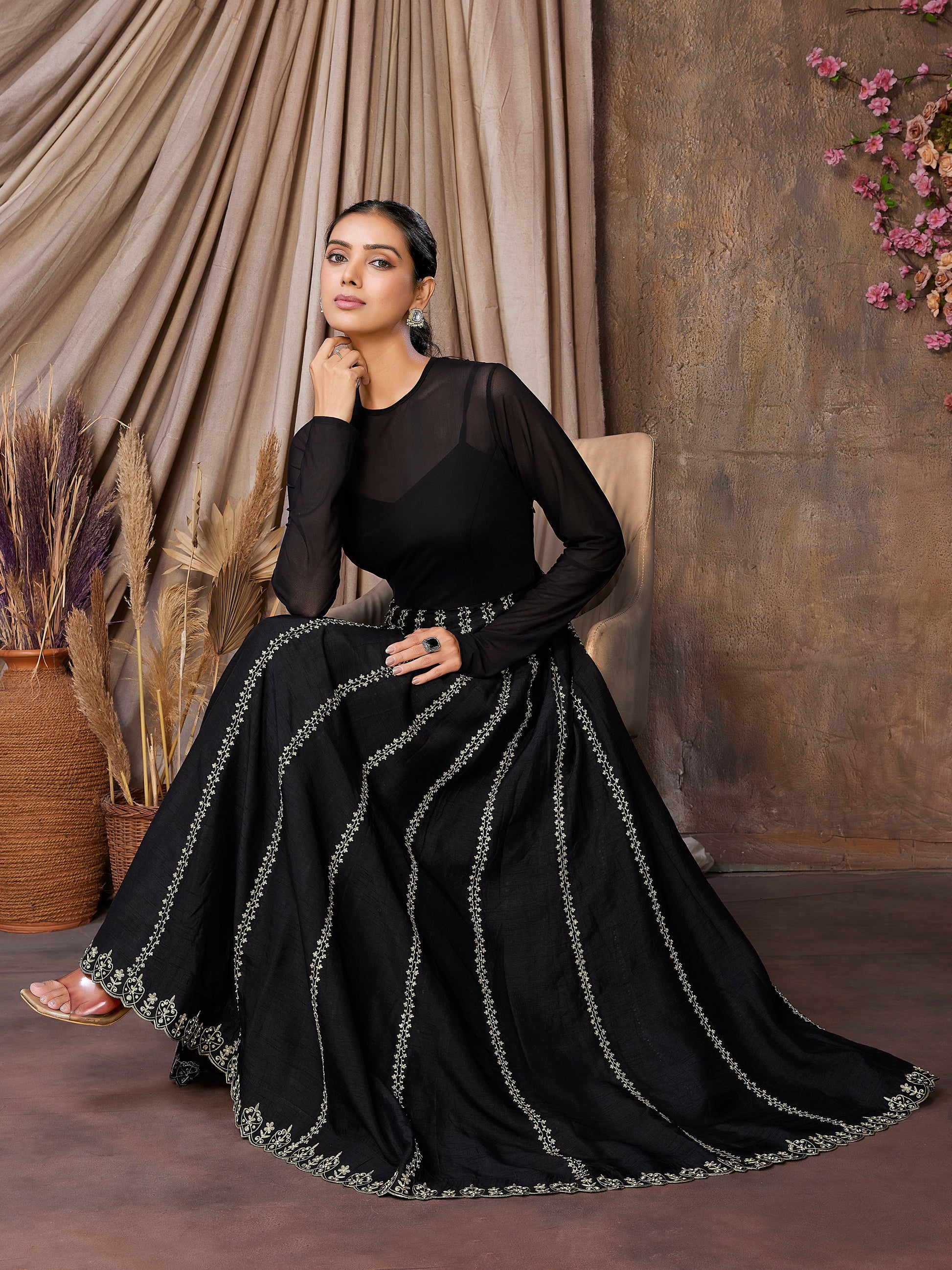 Black Flatro Silk & Lycra Net Indo Western Dress with Cut Work Border and Hand Embroidery