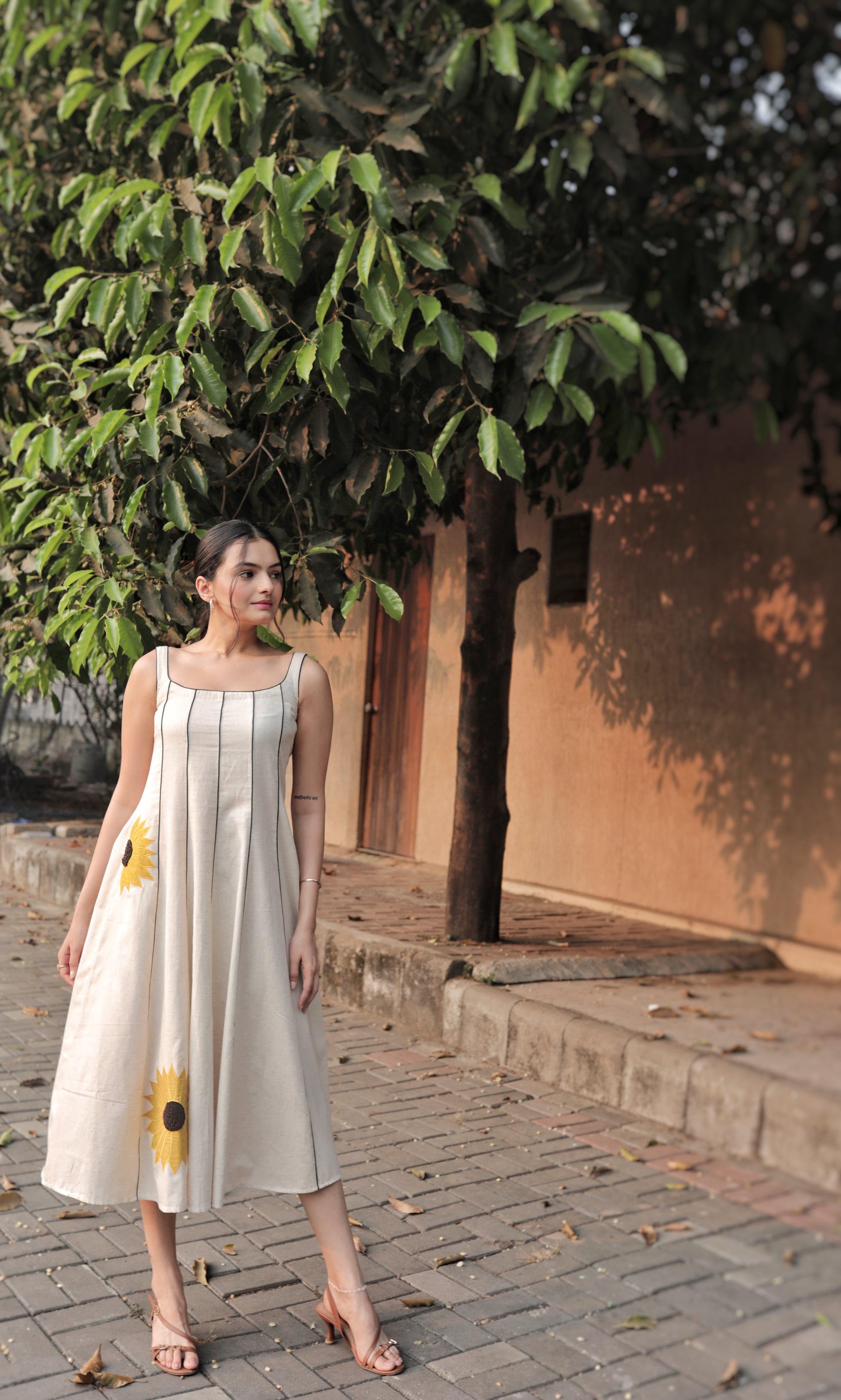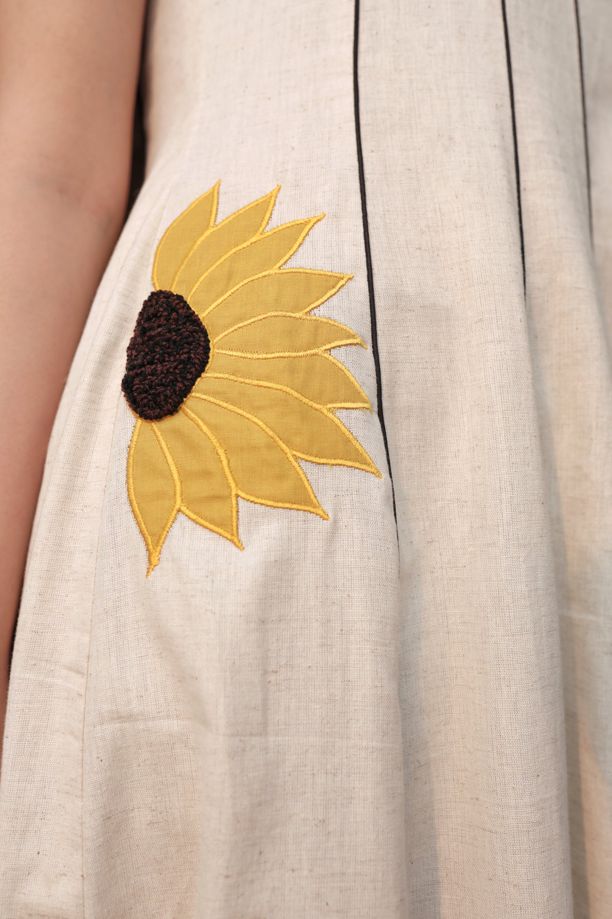Detail: Sunflower patchwork | Black piping | Flowy maxi length